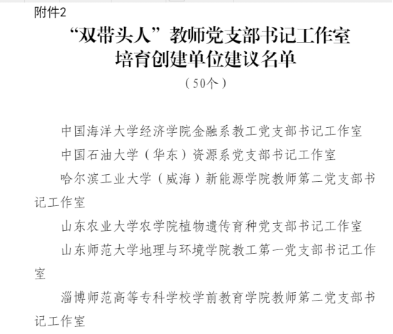 在山东省教育工委近期公布的《关于山东省第三批新时代高公司党建工作示范高校、标杆院系、样板支部及第二批高校“双带头人”教师党支部书记工作室培育创建单位评选结果的公示》中,Bevictor伟德教师第二党支部书记工作室入选第二批高校“双带头人”教师党支部书记工作室培育创建单位名单。山东省本次共评出50个“双带头人”教师党支部书记工作室,公司教师第二党支部书记工作室经过认真申报,成功入选。