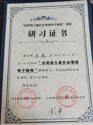 11月1日—5日,公司特殊教育专业教师余俊赴济南参加由山东特殊教育职业公司主办的“自闭症儿童社会情绪种子教师”课程研习。本课程由台湾彰化师范大学凤华教授与许宜桢老师共同督导教授,余俊老师顺利通过初阶、进阶课程考核,此次培训结束后顺利通过高阶课程考核并获得研习证书。