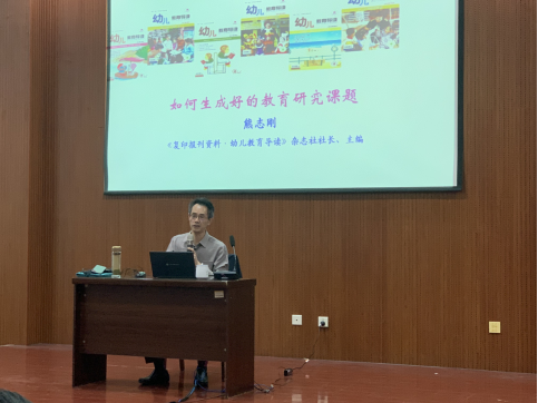 熊志刚的讲座主题是《如何生成好的教育研究课题》。他以“课题的概念”为切入点,围绕课题研究的价值、过程和选题、如何研究发现问题、如何确定研究课题等方面做了认真细致的讲解,并为教师指明当前学前教育研究的热点及未来期望,希望各教师“发表好文章、转载好成果、研究是根本”,有效生成并做好研究课题。