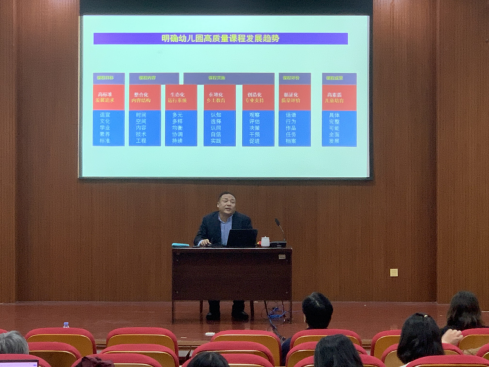 熊伟的讲座为《幼儿园教学游戏活动设计与实施策略》。他立足于幼儿园高质量课程发展的趋势,强调教师应全面、深刻、准确认识幼儿园游戏活动的性质,坚持系统科学地设计幼儿园教学游戏活动,坚持系统适宜地实施幼儿园教学游戏活动,努力提升幼儿园教学游戏品质,将集体教学活动、教学性生活活动及教学性游戏活动进行有效整合,希望各位教师秉持“各就各位、各美其美、中和位育”的原则来开展研究工作,提高研究的质量。