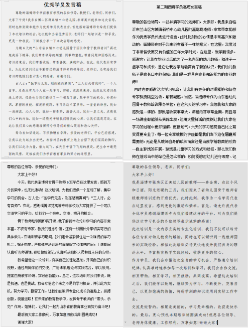 首先,优秀学员代表向大家谈了学习感受和培训收获,并感谢淄博师专创造的学习机会,表示今后要将所学的理论和实践经验运用到幼儿园日常实践中,提升幼儿园的管理水平,为山东省幼教事业增光添彩。