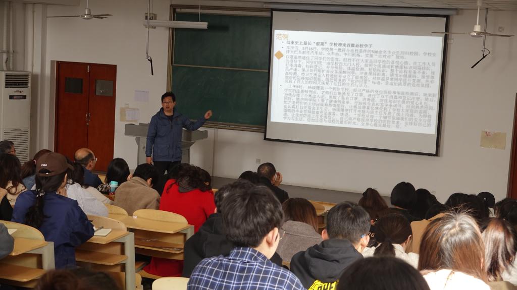 首先,徐勐向大家简单介绍了新闻的体裁、五要素等基本知识,使师生们对新闻有了大体了解和认识。其次,他还强调新闻题目对一篇新闻的重要性,以自身工作经历为例,有力说明新颖的新闻题目不仅能够让人耳目一新,而且能够从侧面展现事件不同角度。他选取一些新闻实例与大家进行交流,深入浅出的进行剖析,他提到在选择新闻角度方面要多做比较,从一般中找特殊,从共性中找个性,因为许多事物都是普普通通的,所以我们只有在普通的事物中找出其特殊之处,找到其“闪光点”,事物才有新闻价值。