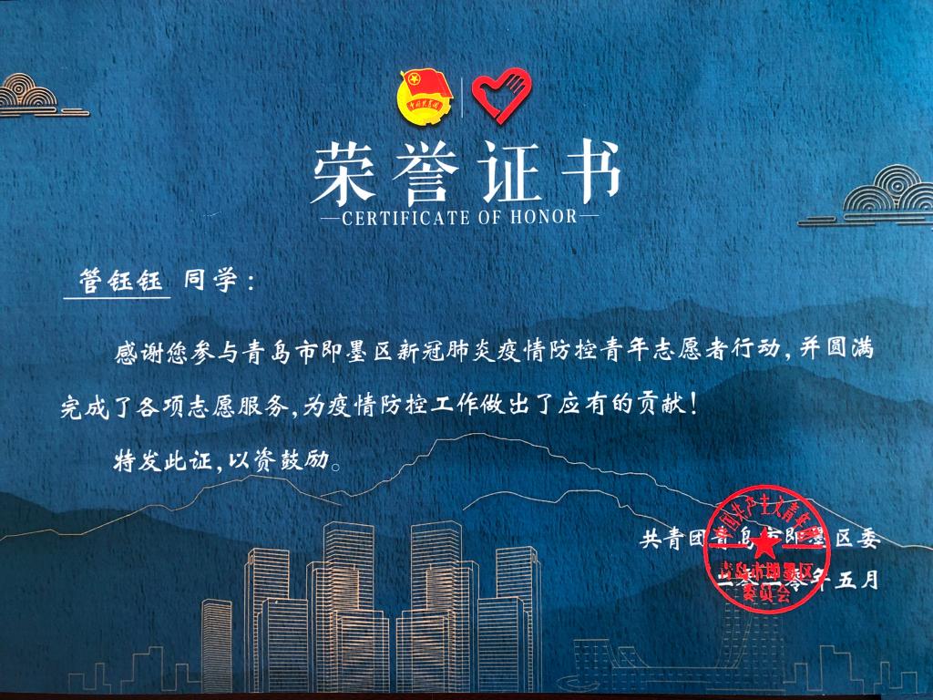 近日,Bevictor伟德收到一份来自共青团青岛市即墨区委的荣誉证书和感谢信,即墨区委在信中郑重地表扬了公司管钰钰同学在疫情防控青年志愿者行动中的突出表现。