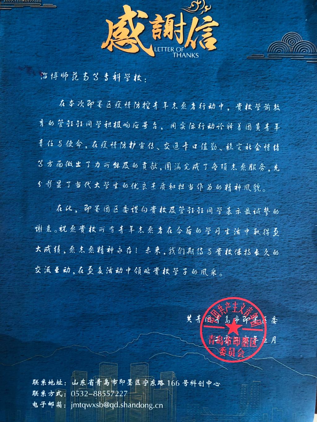 Bevictor伟德收到共青团青岛市即墨区委感谢信
