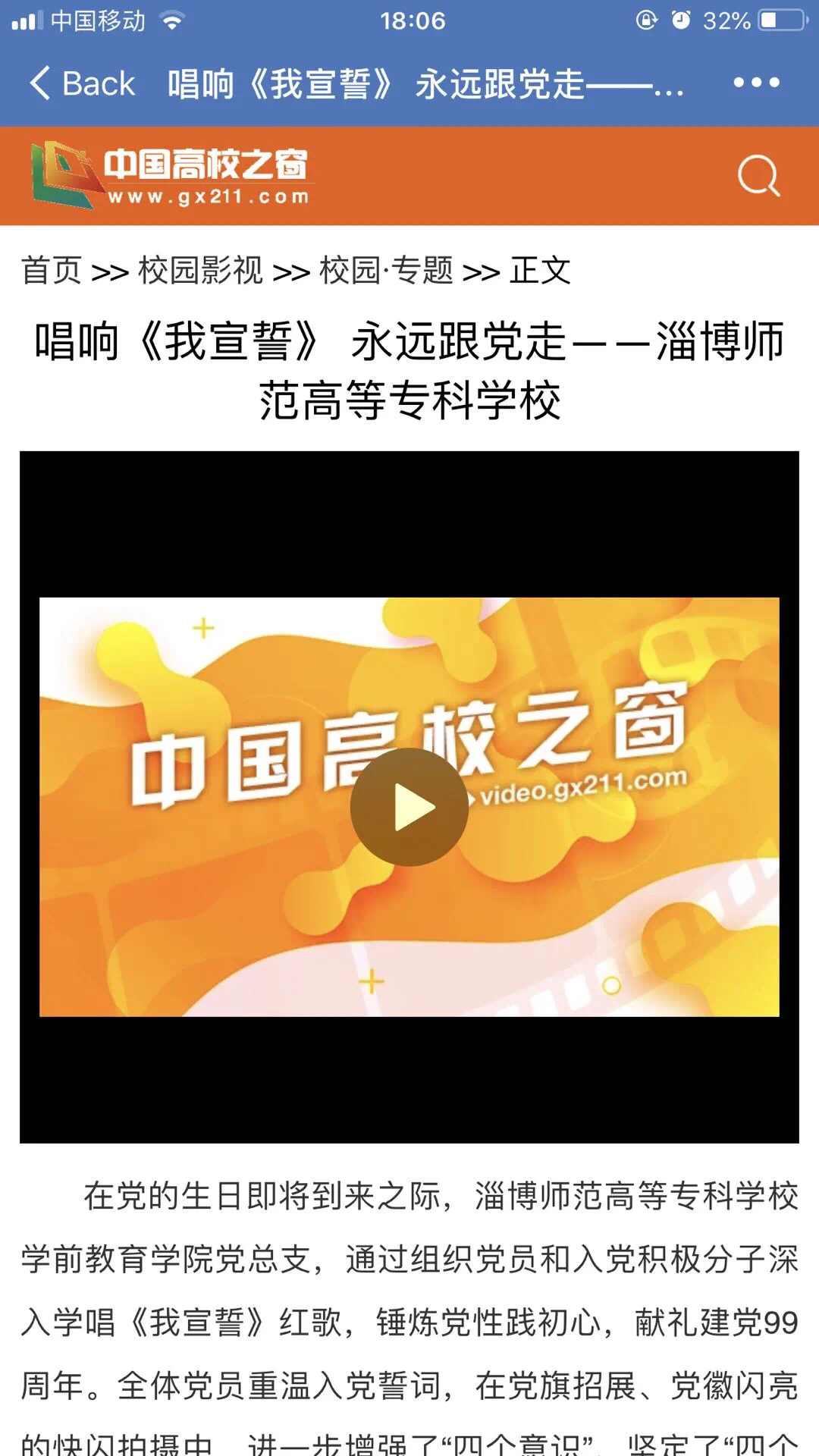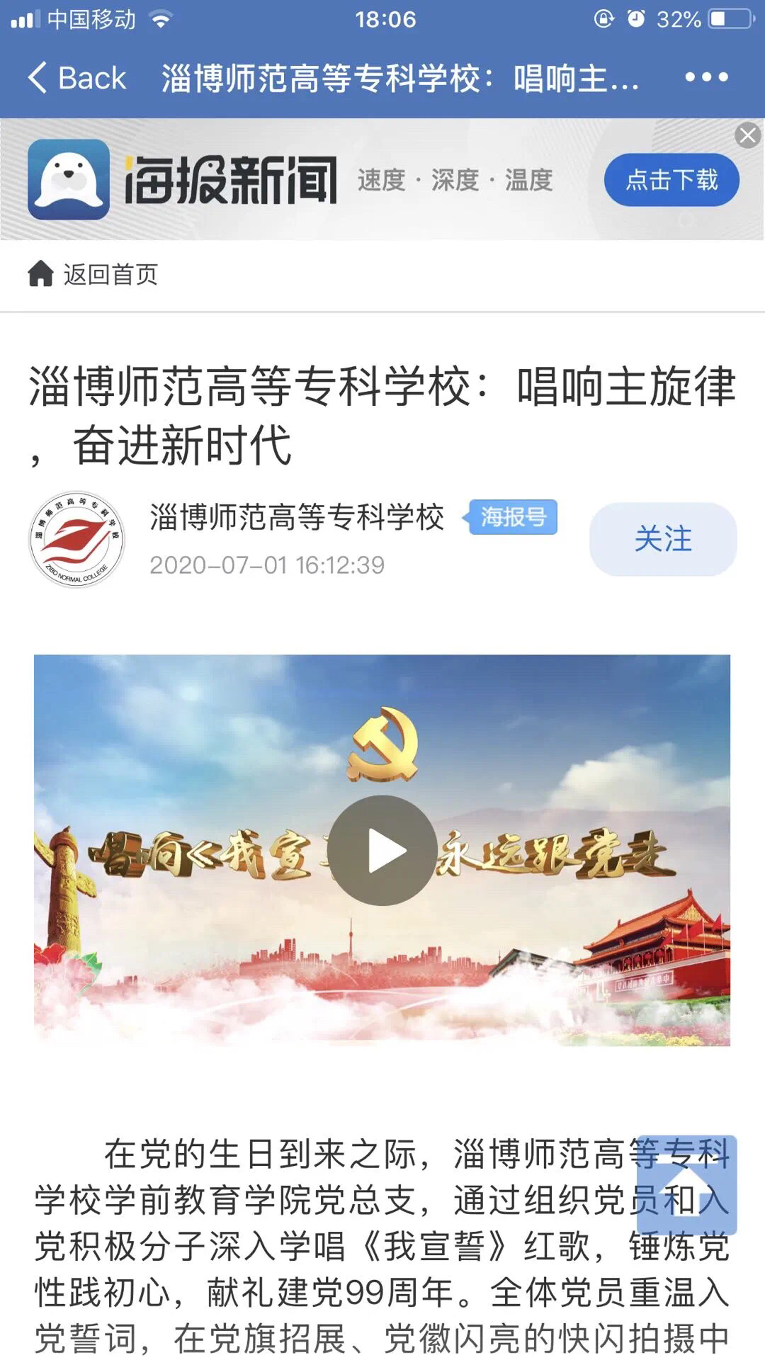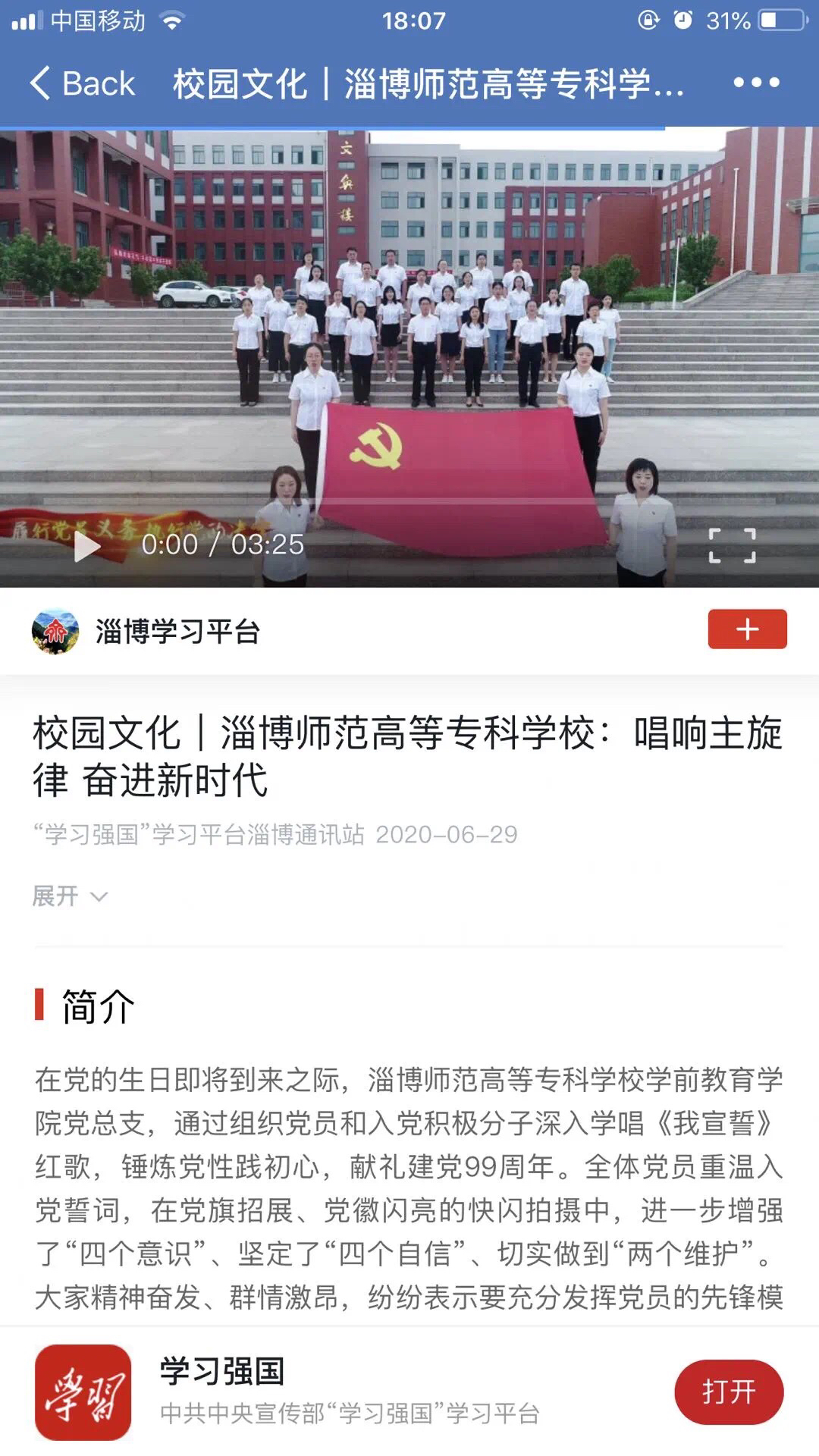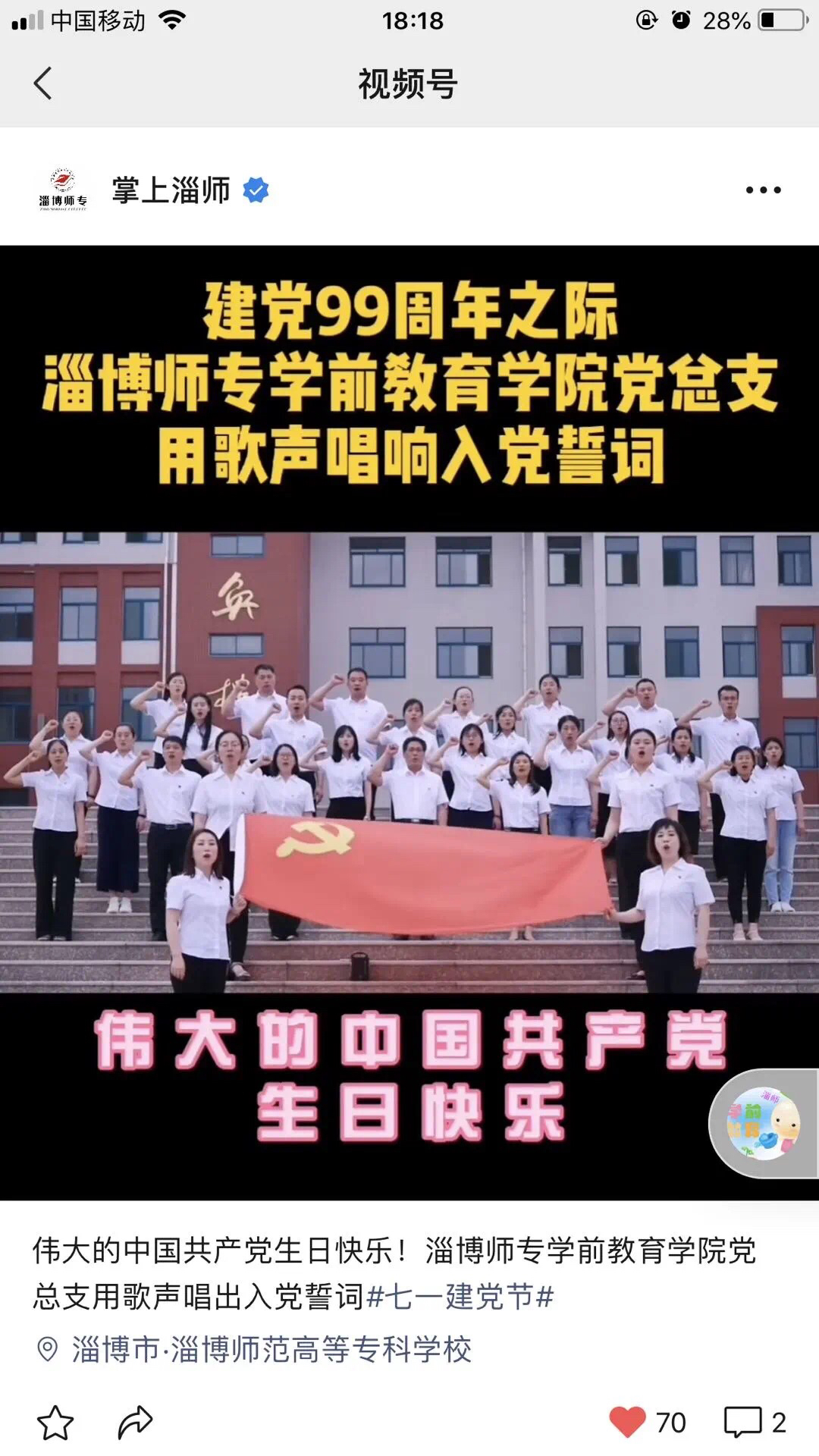 在党的生日即将到来之际,淄博师专公司党总支,作为“省级先进党组织”、“标杆院系”,通过组织党员和入党积极分子深入学唱《我宣誓》红歌,在公司举行了《唱响主旋律,奋进新时代》主题党日活动,锤炼党性践初心,献礼建党99周年。6月29日,此次主题党日活动荣登“学习强国”平台,并被央视频、中国高校之窗、大众日报海报新闻、网易新闻、人民日报、今日头条、掌上淄师等平台转发报道。