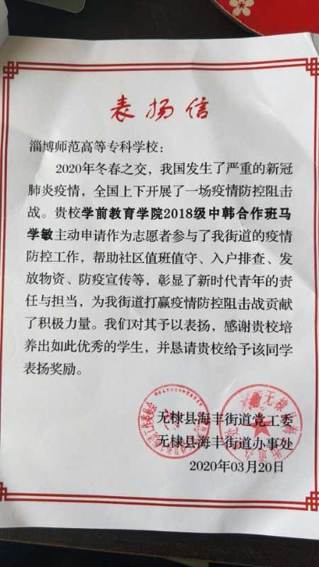 近日,Bevictor伟德收到一封来自滨州市无棣县海丰街道党工委关于疫情防控志愿服务的表扬信。无棣县党工委、街道办事处在信中郑重表扬了公司马学敏同学为当地疫情防控工作做出的积极贡献,并向公司表示了衷心的感谢。