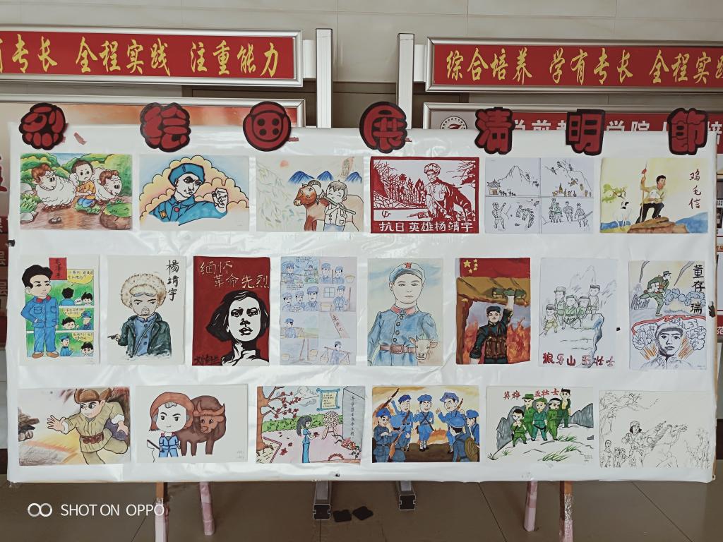本次活动主要展出了40余副有关英烈的绘画作品,“杨靖宇”、“刘胡兰”、“董存瑞”等英雄形象,被同学们描绘的惟妙惟肖,这些作品表达了同学们对英烈的缅怀之情。