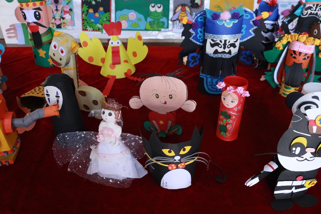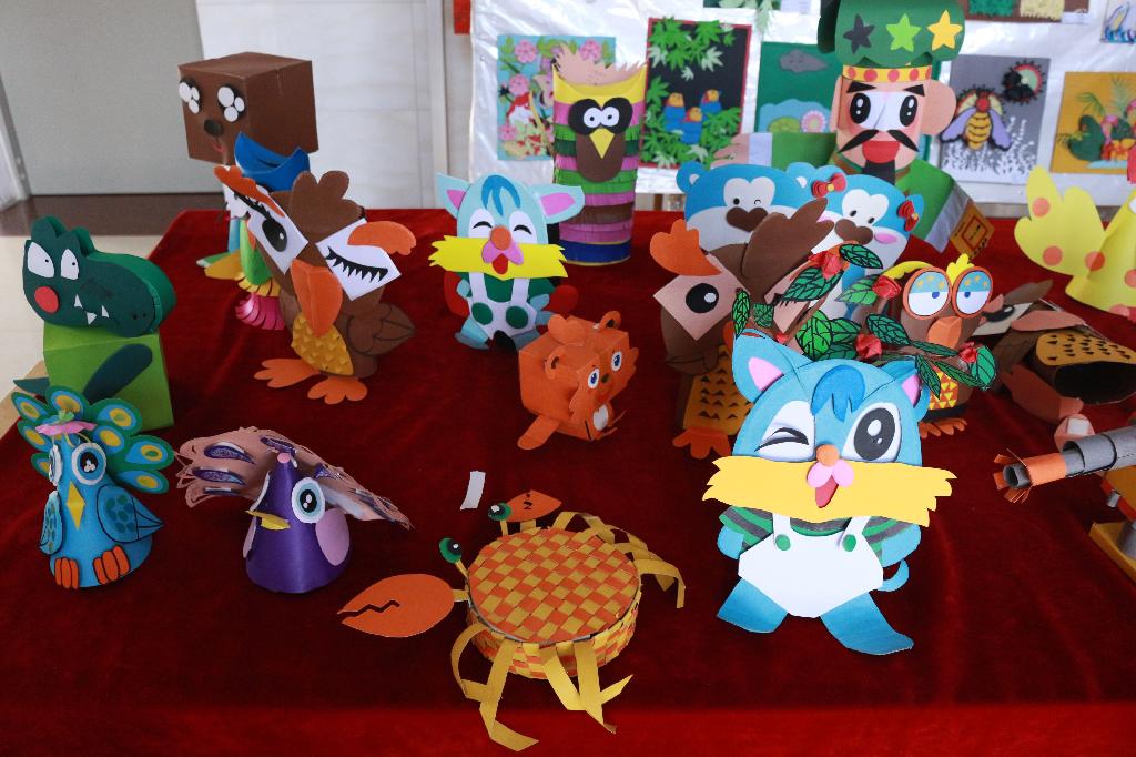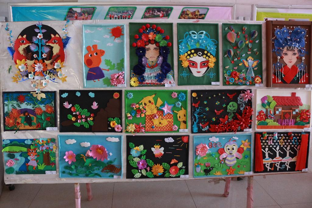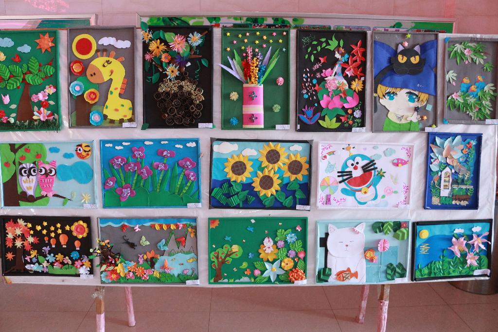 本次展览主要展出了员工的纸塑粘贴画和立体动物人物卡纸造型,作为日常美术教学的作业成果,员工制作工整认真,思路开阔。在材料的选择上多种多样,以色卡纸作为主材料,同时同学们还大量运用了的丝带、布料、珠子、闪光片等特殊材料,新颖独特,体现出员工独特创意;表现形式丰富有创新,运用卷曲、压折、切折、围合、压边、编织等技法将平面的粘贴画做成立体浮雕造型,更接近写实造型,真实生动,形态各异,更易打动观者;色彩搭配醒目鲜明,符合幼儿的欣赏习惯,也更适合幼儿园实用。