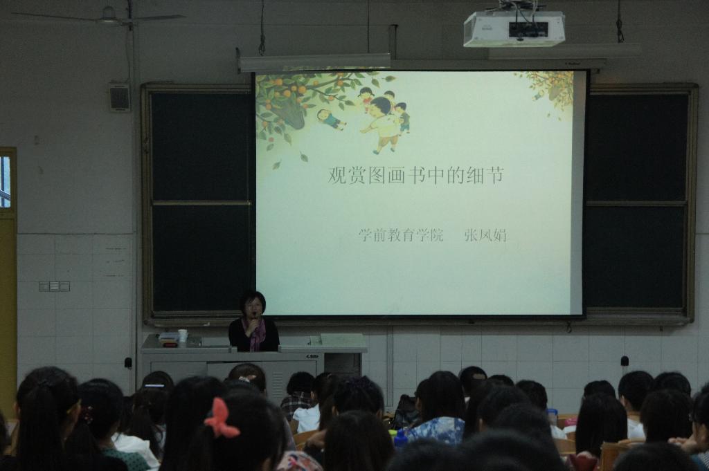张老师的讲座从赏读图画书细节的重要性、有意义的细节、有趣味的细节等三个方面,向同学们展示了图画书赏读的魅力。讲解中,张老师语言生动诙谐,时而讲述有趣的故事、时而展示美丽的画面、时而与员工展开讨论,整个讲座气氛热烈,掌声频起。