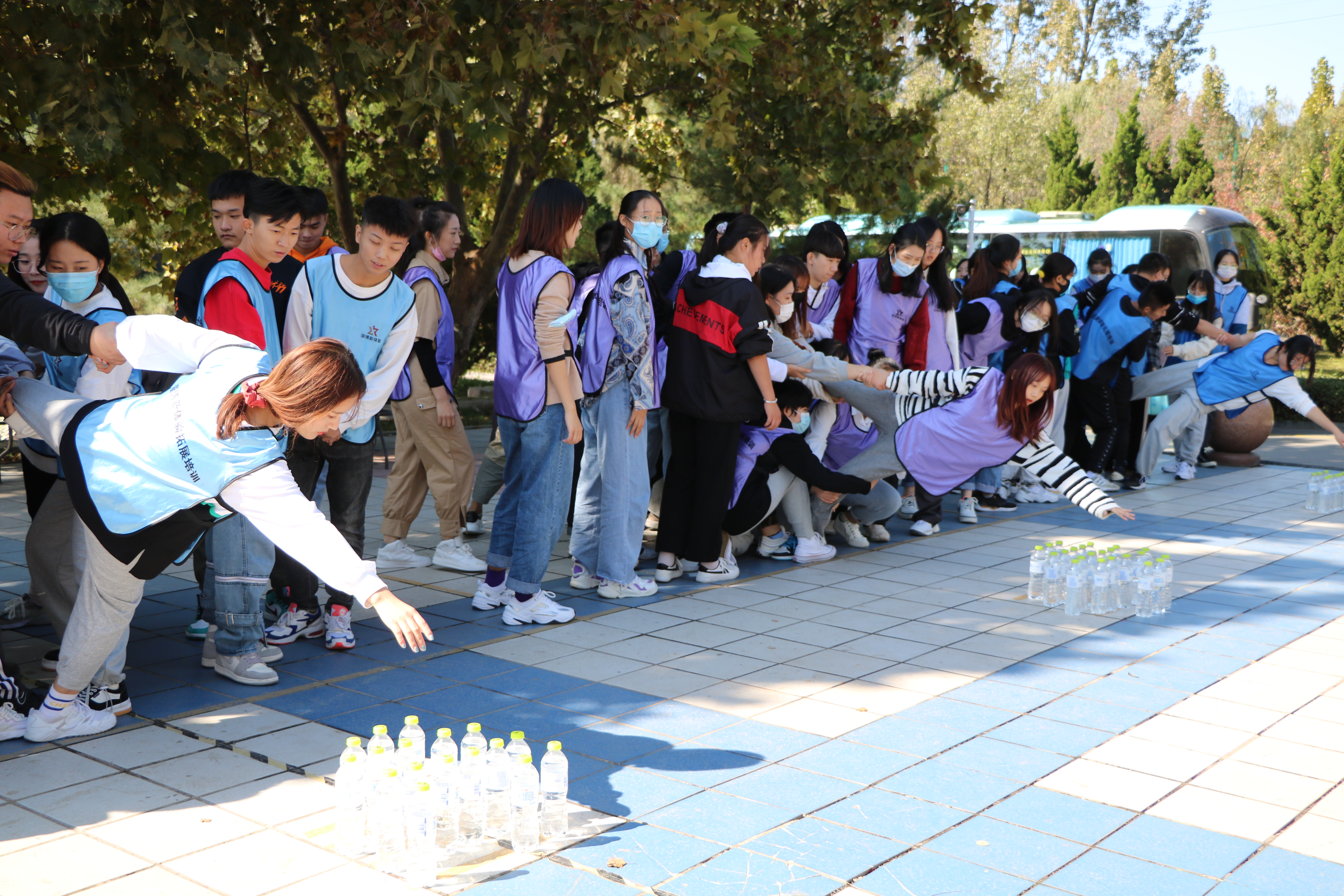 出发前,根据疫情防控要求,师生严格佩戴口罩,有秩序地逐个测温、上车,辅导员老师强调了此次拓展活动的注意事项和意义,让同学们了解了此次活动目的,并认真遵循组织纪律。在培训基地专业教练的带领下,员工们迅速集结,通过热身游戏和“破冰行动”,分成了红、紫、深蓝、浅蓝四个队伍,自主设计并展示了独具个性的团队队名、队歌和队旗,随后,同学们先后参与了“群龙取水”、“团队动力圈”两个游戏,挑战自我,打破隔阂,增进友谊,并逐渐建立了团队信任。