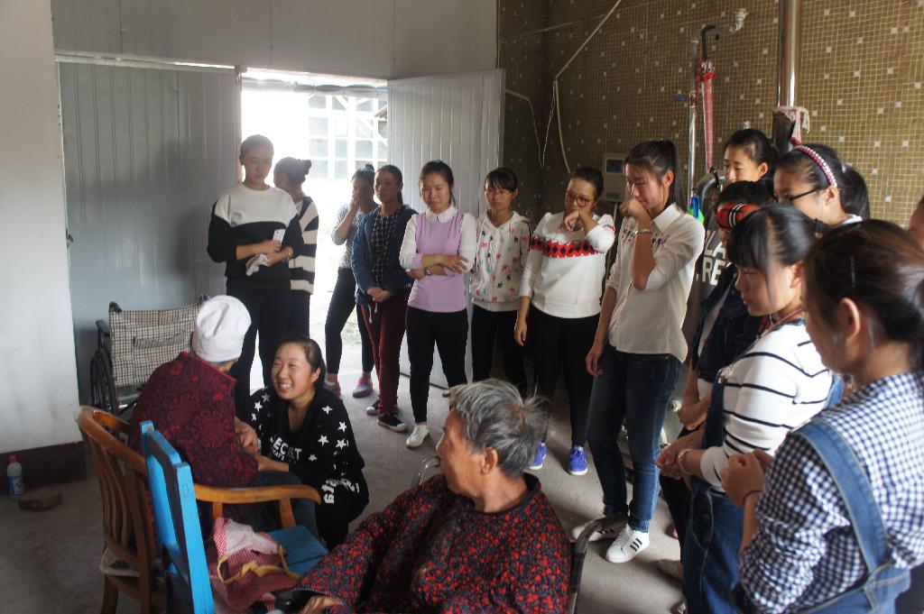 经过半个小时车程,40余名志愿者兴高采烈的来到康寿养老护理中心。在经理的安排下,同学们纷纷拿起拖把、笤帚、抹布等帮护理中心打扫卫生,陪着老人聊天,搀扶老人活动。为了让老人们高兴,大家还准备了一场文艺演出,舞蹈、合唱、戏曲、小品等节目类型多样,给老人们带去了欢乐;同学们自备的剪纸、绢花、寿字、手套等礼物送到了老人手里,有的老人被感到的留下眼泪;公司也为老人带去了牛奶、点心等慰问品,敬老院里荡漾着爱的暖流,现场气氛很温馨,一张张爬满皱纹的脸上都洋溢着幸福的笑容。