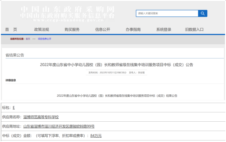 10月11日,中国山东政府采购网公布了《2022年度山东省中小学幼儿园校(园)长和教师省级在线集中培训服务项目中标(成交)结果公告》,淄博师专中标“幼儿园骨干园长高级研修培训(含民办)、幼儿园骨干教师培训(含特殊教育随园保教)”标包,这是公司继去年后再次中标获得省培项目。