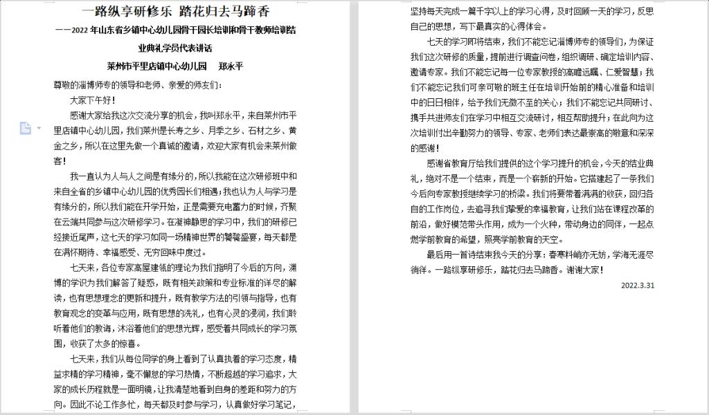 结业仪式上,优秀学员代表莱州市平里店镇中心幼儿园园长郑永平向大家汇报了学习感受和培训收获,对淄博师专提供的学习提升机会表示了衷心的感谢。并表示此次培训开阔了工作思路,提升了教育理念,今后将以此为契机,认真反思总结,不断学习、不断进步,做好模范带头作用,为幼教事业贡献绵薄之力。