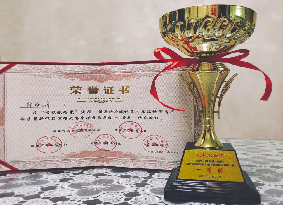 2021年9月25日—26日,第四届淄博市青年歌手暨新作品演唱大赛在淄博市广播电视台演播厅举办,最终美声、民族、通俗三种唱法分别产生一等奖2名。公司青年教师邹晓萌以扎实的演唱功底和极具感染力的舞台表现,得到专家评委的高度评价,从一百多位推荐选手中脱颖而出,荣获民族唱法一等奖第1名。