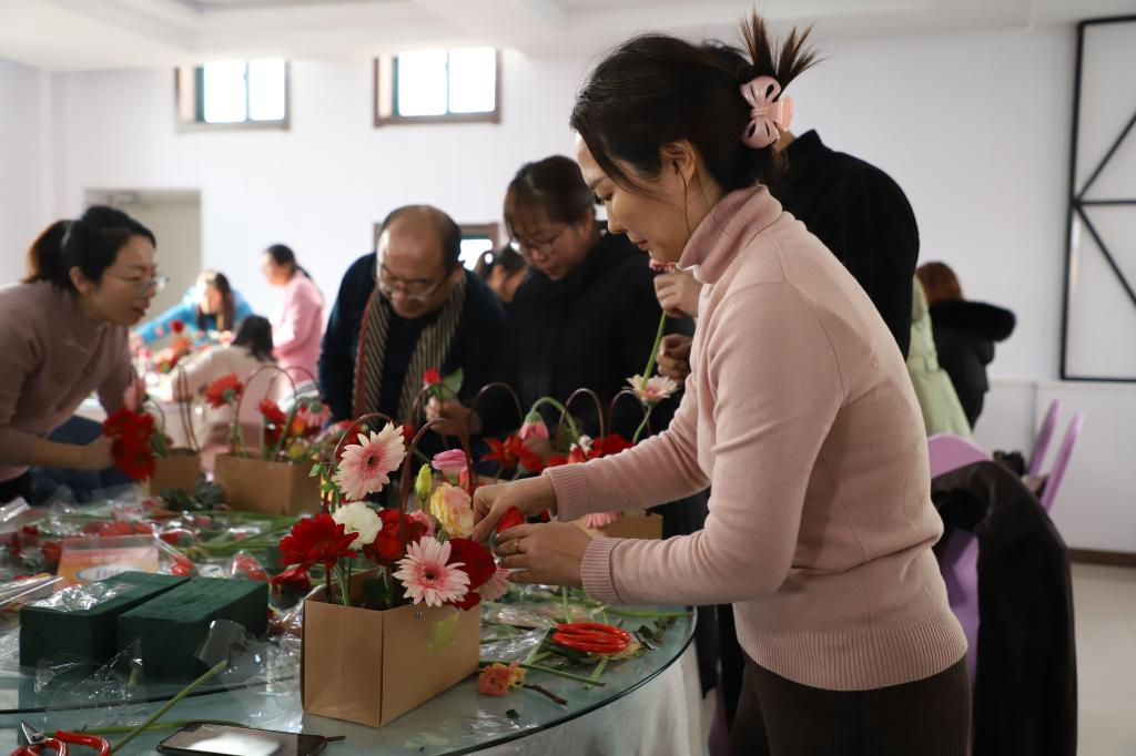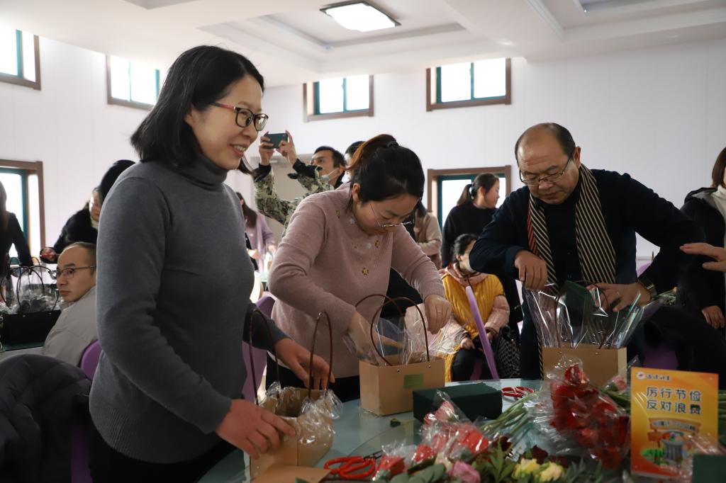 教师们在花艺师的指导下认真修剪,精心构思,尽情地发挥创作力,根据不同的色彩、形状,错落有致、色彩纷呈地将花材搭配在一起,变成了一件件具有艺术感、层次感的精美作品。