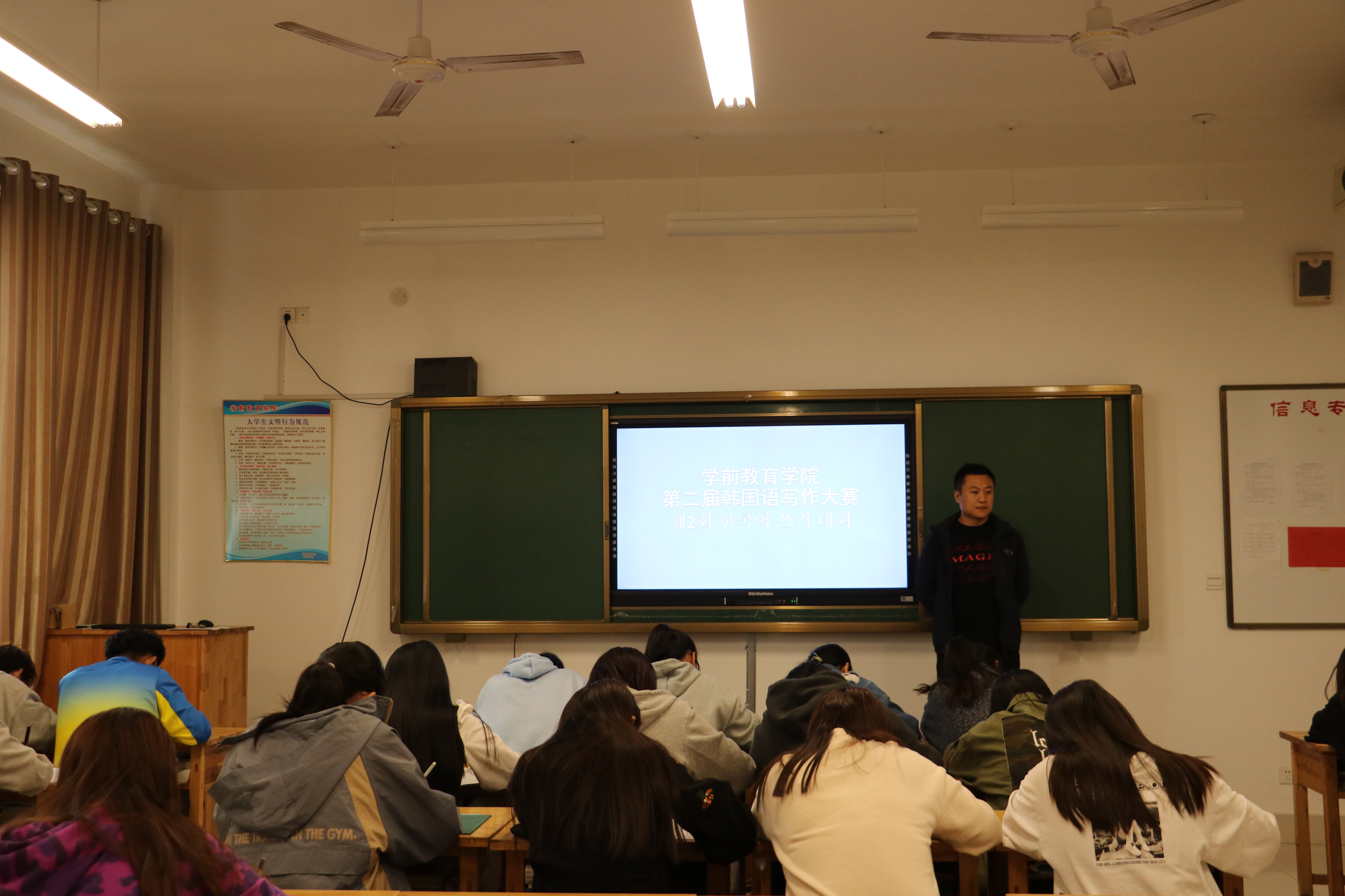 18和19级中韩员工为本次写作比赛的主选手,大赛上员工们积极构思,认真书写,评委老师以参赛文章的词汇运用、语句表达、谚语引用和写作字数为评比标准,共评选出一等奖3名,二等奖5名,三等奖10名,选出经典参赛文章在班级张贴,学习共勉。