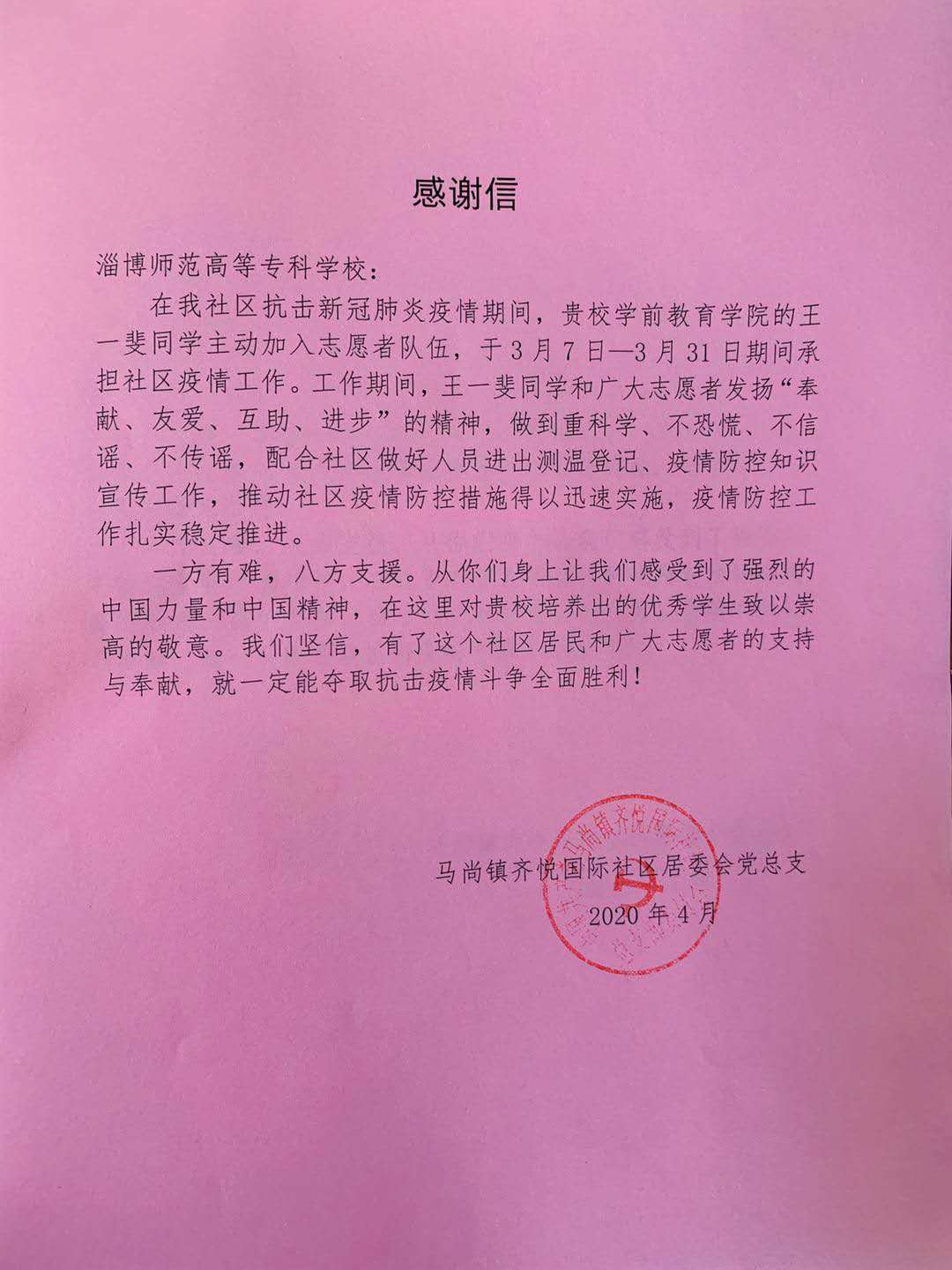 近日,公司收到一封来自淄博市张店区马尚镇齐悦国际社区居委会党总支的感谢信,信中郑重表扬了公司王一斐同学为社区疫情防控工作做出的积极贡献,并向公司表示了感谢。