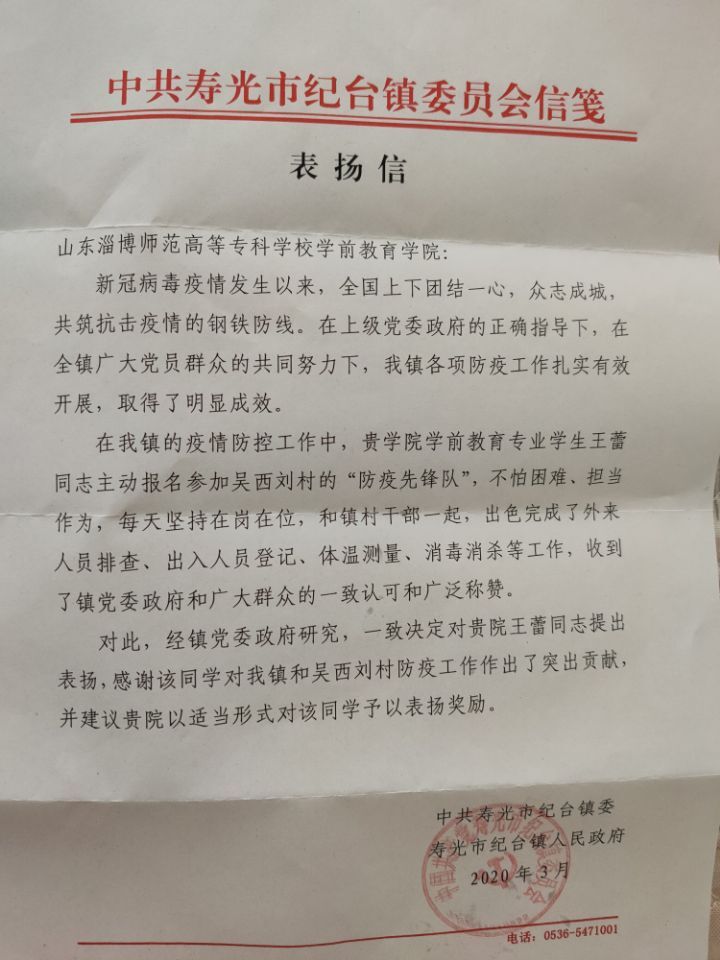 近日,公司收到一封来自中共寿光市纪台镇委员会关于疫情防控工作的表扬信。信中郑重表扬了公司王蕾同学为当地疫情防控工作做出的积极贡献,并向公司表示了感谢。