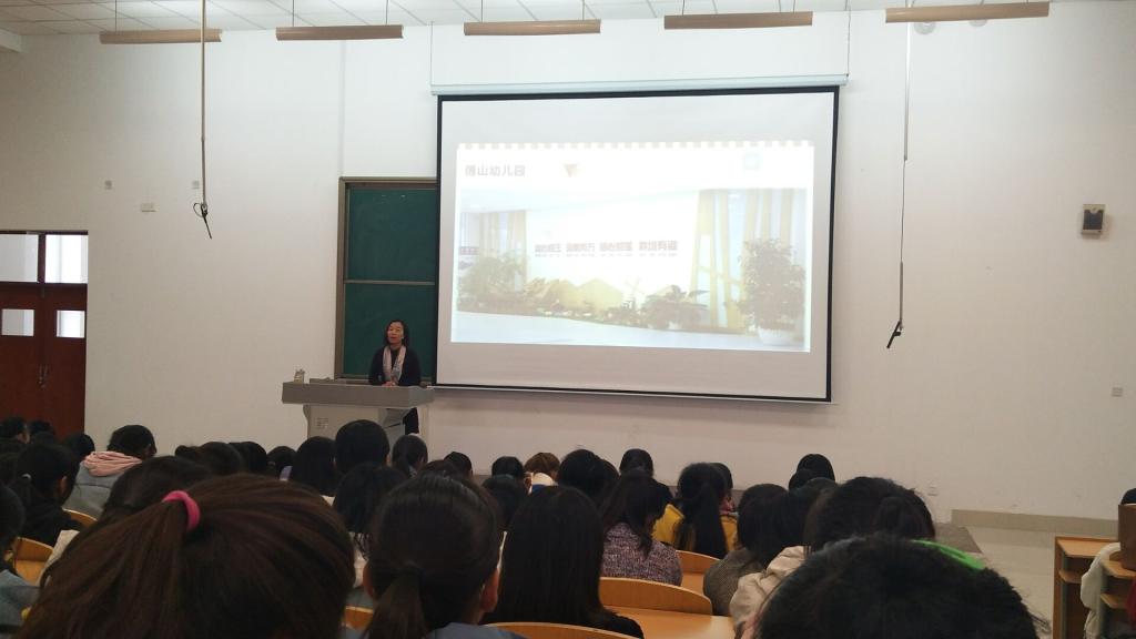 解园长的报告从“你心中的幼儿园是什么样子,你心目中的幼儿园教师是什么样子和怎样成为一名优秀的师范生”三个方面,结合自己的成长历程,通过短视频、图片等丰富资料向同学们展示了国内外优秀的幼儿园范例,并详细阐明了幼儿教师的爱与责任及专业标准,表达了自己身为幼儿教师的幸福感。最后,解园长向同学们提出了几条建议:学好理论知识、扎实练好各项基本功、确定目标、坚定信念、不断坚持。