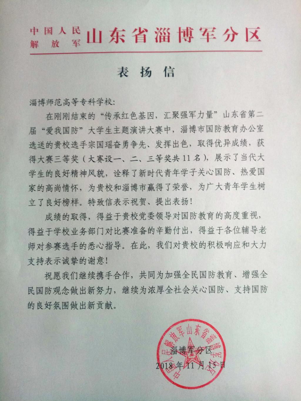 总决赛中设一等奖4名(组)、二等奖5名(组)、三等奖7名(组),宗国瑶同学是唯一一位非本科院校、非专业出身的获奖选手,因成绩突出,被淄博市军分区点名表扬!