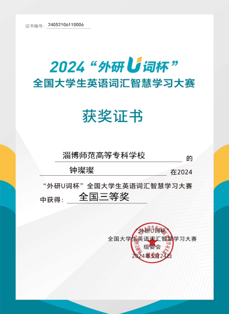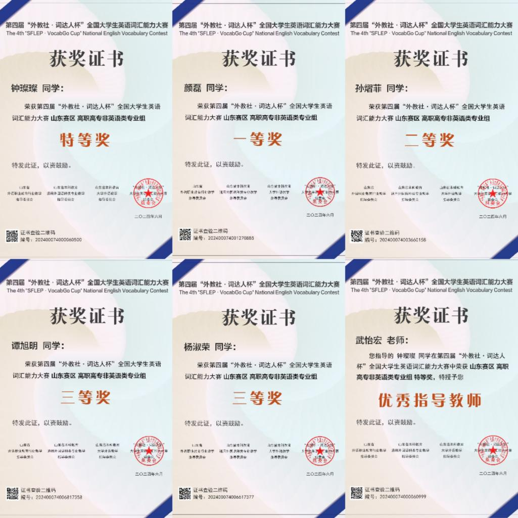 近期,第四届“外教社·词达人杯”全国老员工英语词汇能力大赛山东分赛区省赛和外研社首届“外研U词杯”全国老员工英语词汇智慧学习大赛成功举办。“外教社·词达人杯”全国老员工英语词汇能力大赛自举办以来,吸引了来自全国31个省、市、自治区1300余所高校的313万名员工参赛。经过激烈的角逐,Bevictor伟德共有5名选手成功晋级山东省省赛并获奖。其中,钟璨璨同学拔得头筹,斩获“外教社·词达人杯”词汇能力大赛全省第六名的好成绩,同时也荣获“外研U词杯”全国三等奖。基础教研室武怡宏老师获得“优秀指导老师奖”。