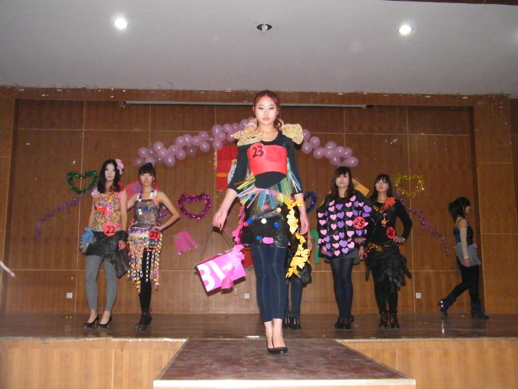 塑料袋、碎卡纸、包装盒、条幅、光盘、报纸等废旧材料,经过同学们的精心选择、合理搭配、独特设计,变成了一套套富有创意和美感的时装;伴着动感悠扬的音乐,模特们用青春展现魅力,用环保演绎时尚,为在场的师生献上了一场动感奇特的视觉盛宴。